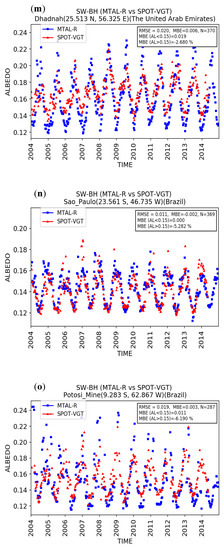Another temporal inspection was taken over the period 2004 to 2014, by comparing MTAL-R with SPOT-VGT. The comparison was performed over boxes of 50 km × 50 km around a large number (337) of stations located in Europe, Africa and South America that are representative of a large variety of land cover types. Overall, MTAL-R albedo values tend to be lower than SPOT-VGT albedo values with an MBE of −0.012. This underestimation is observed for MTAL-R values below the 0.15 threshold, with an MBE of −0.022, while for MTAL-R above 0.15, MTAL-R albedo values are higher than SPOT-VGT with a relative mean bias error of +0.158%. If we consider SPOT-VGT as the valid reference, MTAL-R only meets the requirements for albedo values larger than 0.15 and does not meet the requirement for albedo values lower than 0.15. For albedo values lower than 0.15, we believe that the requirement may be too restrictive, as differences of angular sampling between polar orbiting and geostationary satellites may lead to surface BRDF discrepancies, especially in winter over mid and high latitudes (see Figure 5a and Figure 7a).