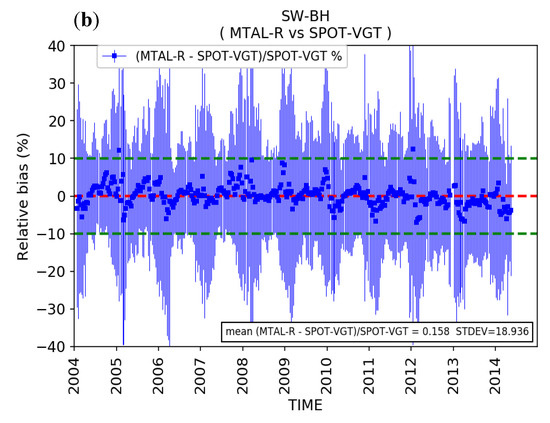 In order to draw global conclusions Figure 5 displays the difference between MTAL-R and SPOT-VGT averaged over all 337 sites between 2004 and 2014. For the calculation of the mean bias, MTAL-R values below 0.15 are considered. For the calculation of the mean relative bias MTAL-R values greater than 0.15 are considered. These aspects derive from the definition of the requirements in Table 2.