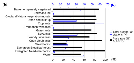 Finally Figure 8 shows the pass rate per land cover type. This information on the type of surface is retrieved from the MODIS Land Cover product, which provides a global map with 17 land cover types. The MODIS Land Cover product at 5’ of resolution was used [50]. For our study, we assigned the predominant land cover type corresponding to the MODIS land cover type map from 2010 to each 50 km × 50 km box centered over the AERONET stations. In a second time, the pass rate results given in Figure 7 are split by cover type. Again, the results are given for the two regimes of albedo values. On the one hand, MTAL-R albedos lower than 0.15 show a pass rate higher than 50% for all cover types except for “Cropland/Natural vegetation mosaic”, “Urban and built-up”, “Croplands”, “Grasslands”, and “Water” (which corresponds to stations on small islands or along the coastlines). On the other hand, the pass rate for albedo values higher than 0.15 is higher than 50% for all cover types except for “Mixed Forest”.