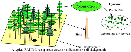 Thus, RAPID was developed based on RGM for large-scale forest scenes, which is considerably easier to use and faster than RGM2. RAPID is capable of simulating the bidirectional reflectance factor (BRF) over various kinds of vegetated scenes (homogeneous or heterogeneous). Unlike the thousands of polygons used in RGM2, RAPID uses dozens of porous objects to represent a group of grass or crop plants or tree crowns (see Figure 1). Each porous object has several properties, including shape, size, thickness, LAI, leaf angle distribution (LAD), and leaf clumping conditions. These properties are used during dynamical generation of the subleaves within porous objects at run-time; hence, only view factors between porous objects (not between hundreds of small leaves) need to be calculated and stored. As a result, the model significantly reduces the huge memory requirement and long computation time of view factors for a large and realistic vegetation scene.