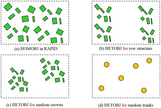 The illustration of concept extension on porous objects containing leaves (rectangles) or stems (circles): (a) homogeneous porous object (HOMOBJ) used in RAPID; (b) heterogeneous porous object (HETOBJ) used in RAPID3 for row-structured crops containing two rows; (c) HETOBJ used in RAPID3 for a forest layer containing two trees; (d) HETOBJ used in RAPID3 for a trunk layer containing six stems.