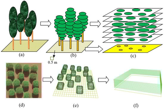 Figure 3 shows the examples of simplifying real-world forests (a and d) into the HOMOBJ in RAPID (b and e), and then into HETOBJ in RAPID3 (c and f). In Figure 3b, RAPID uses six HOMOBJs and one trunk to represent one tree, resulting in 36 HOMOBJs and six trunks. In Figure 3c, the scene is further simplified as the collection of six crowns and one trunk HETOBJ. The soil polygons are kept solid in both RAPID and RAPID3. In RAPID, the soil polygon size should not be too large (the default 0.5 m, Figure 3b) to achieve a good accuracy. However, in Figure 3c, one soil polygon is sufficiently the same size as the HETOBJ. Finally, there are only 7 HETOBJs in Figure 3c. Similarly, the forest stand containing 15 trees in Figure 3d was represented by 300 HOMOBJs in Figure 3e, which was then further simplified as only 20 HETOBJs in Figure 3f.