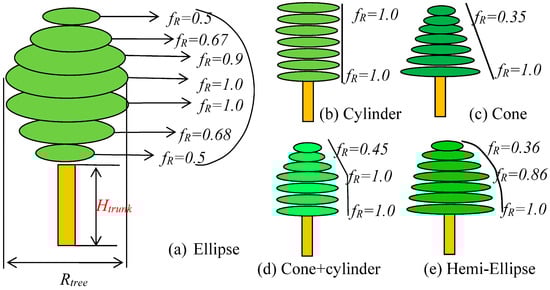To accurately parameterize each HETOBJ, two new input files, TEXTURE.IN and OBJ_CLUMP.IN, were introduced to define tree locations, radii, and radius adjustment coefficients. The TEXTURE.IN file stores the number of crown HOMOBJs within a HETOBJ, relative coordinates (Xtree, Ytree) of each HOMOBJ center to the lower-left corner of the HETOBJ, and the maximum radius of each HOMOBJ (Rtree). It is assumed that all HOMOBJs within the HETOBJ have the same circular shape, thickness, LAI, LAD, trunk diameter (Dtrunk), and optical parameters. The number of crown HOMOBJs controls the stem density. Changing the (Xtree, Ytree) of each tree can adjust the spatial distribution of crowns within a HETOBJ. The OBJ_CLUMP.IN file defines the tree radius adjustment coefficients (fR) that are compared to Rtree for a crown HOMOBJ within a HETOBJ (see Figure 4). Therefore, the Rtree and fR at different heights can control the tree crown vertical shape to be a sphere, cone, or any other user-defined profiles.