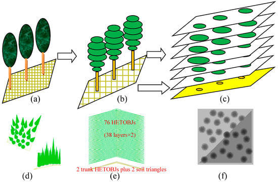 The illustration of 3D scenes using HETOBJs: (a) a forest stand with six trees; (b) abstraction of the forest in (a) using 36 HOMOBJs; (c) abstraction of the forest in (a) using only 7 HETOBJs; (d) a forest stand with 15 trees; (e) abstraction of the forest in (d) using 300 HOMOBJs; (f) abstraction of the forest in (d) using only 20 HETOBJs.