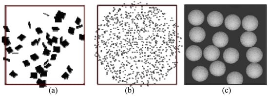 where Ω(θ, φ) is the leaf orientation direction with zenith angle θ and azimuth angle φ; f(θ) is the LAD function varying with θ, but independent of φ. As a result, the total pixel number in Figure 6a,b should be equal if the same size target 2D arrays are used. In other words, the gap fractions in Figure 6a,b are the same. However, the same 2D array size can be used to project more HOMOBJs in RAPID3 as long as their gap fractions are kept constant. For example, Figure 6c shows the projected random pixels of the scene defined in Figure 3f.