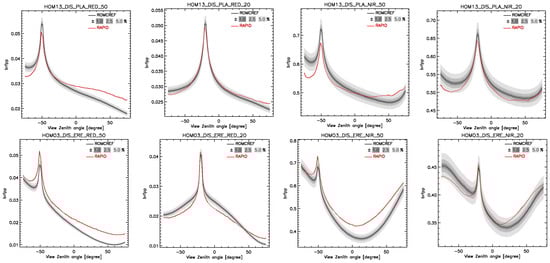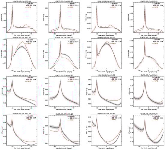 Figure 8 shows eight groups of BRF results from both HOM13 and HOM03. In the subtitles, “HOM13_DIS_PLA” and “HOM03_DIS_ERE” refer to HOM13 and HOM03, respectively; the RED and NIR mean the red and NIR band; the 20 and 50 refer to SZA. The RAPID BRF curves are generally consistent in shape with the reference data provided by ROMC (ROMCREF in Figure 8) except a few biases (mean RMSE = 0.014, see Table 2). The RMSE at SZA 20° is lower than that at SZA 50°, especially in the NIR band (0.0146 vs 0.0486). There are two types of errors at SZA 50°: (a) lower BRF contrast between backward and forward direction; and (b) overestimation for ERE canopy. The accuracy of the PLA canopy is higher than that of the ERE canopy (0.0108 vs 0.0172).