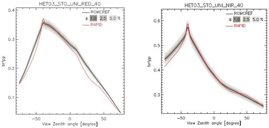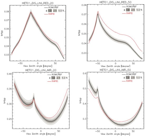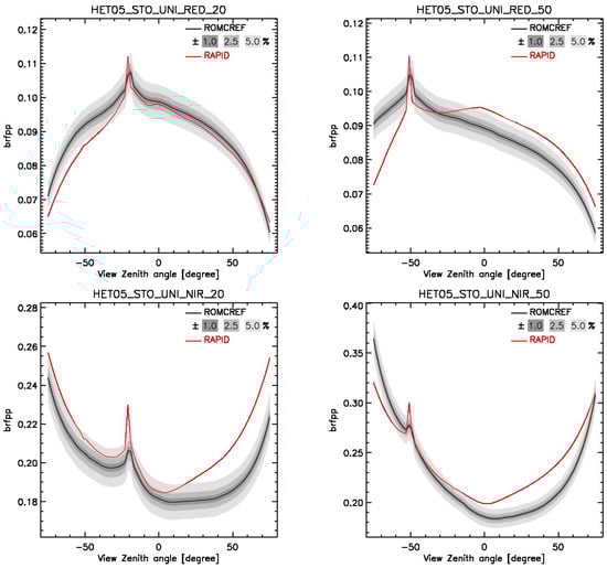 To evaluate the RAPID3 performance, the RAMI online model checker (ROMC, http://romc.jrc.ec.europa.eu) was used, which is a web-based tool allowing model developers to check their canopy RT model performance using assembled reference data (ROMCREF) []. ROMC has two modes: the debug and validate mode. Since the debug mode is better to guide model improvement, the debug mode was used in this study. The BRF in the solar principal plane (brfpp) is selected for comparisons. Generally, ROMCREF has three gray-colored envelopes (similar to error bars) corresponding to 1, 2.5, and 5% variations from the “surrogate truth” BRF. The root mean squared error (RMSE) provided by the ROMC is used to assess the accuracy.