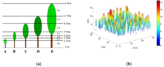 There are 320 HETOBJs and 16 soil polygons used to create the 120 m by 120 m 3D scene (Figure 7h). Each HETOBJ or soil polygon has a size of 30 m by 30 m. The number of crowns within the HETOBJ varies with height. For simplicity, the vertical profile is divided into seven regions (L0 to L6 in Figure 12a). In L0, there is only one class A. In L6, there is only one class E. From L1 to L5, there are 2~4 tree classes, which means that these classes must be averaged to assign a mean LAI and mean reflectance and transmittance for the HETOBJ. The averaging process used the crown leaf areas as weights. Finally, the scene was divided into 20 layers within seven regions. Since the tree radius in these layers is not constant, it should be calculated for each crown in each HETOBJ and listed in the file TEXTURE.IN. Figure 12b shows the crown HOMOBJs (circles) contained in the 20 HETOBJs, where the color represents the height.