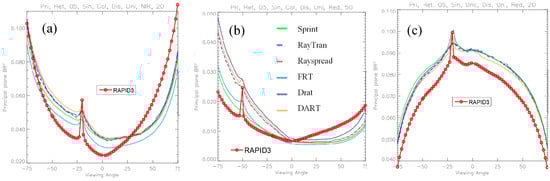 Comparisons of HET05 single scattering BRF results in the principal plane (brfpp) with other 3D models from the RAMI online: (a) leaf scattering in the NIR band at SZA 20°; (b) leaf scattering in the red band at SZA 50°; (c) soil scattering in the red band at SZA 20°.