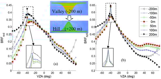 Topography effect on BRF in the red band (a) and the NIR band (b); the small schemes show the two 3D scenes (deep valley and steep hill), where the arrow indicates the scaling series of the z values.