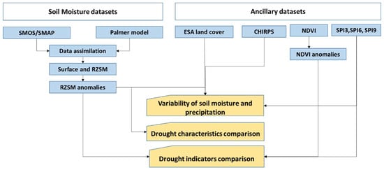 Schematic overview of the methodological approach. SMOS, Soil Moisture Ocean Salinity mission; SMAP, Soil Moisture Active Passive mission; ESA, European Space Agency; CHIRPS; Climate Hazards Group Infrared Precipitation with Station; NDVI, Normalized Difference Vegetation Index; SPI, Standardized Precipitation Index; and RZSM, root zone soil moisture.