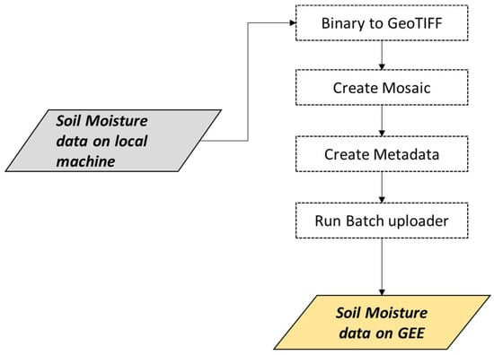 Ingestion of soil moisture datasets to the Google Earth Engine (GEE). The gray and gold boxes represent inputs and outputs, respectively. GeoTIFF, georeferenced tagged image file format.