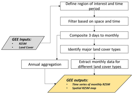 Data processing steps in the soil moisture exploration routine. The gray and gold boxes represent GEE inputs and outputs, respectively. The boxes identified by dotted lines represent the processes that run in the GEE server.