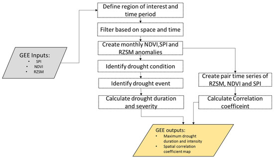 Data processing steps in the drought assessment routine using the GEE. The gray and gold boxes represent GEE inputs and outputs, respectively. The boxes identified by the dotted lines represent the process that run in the GEE server.