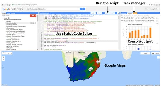 Developed tools are accessible through the links provided in the supplementary materials, though potential users are required to register to access (https://code.earthengine.google.com/). Once the link is clicked, the user is presented with the Google Earth Engine code editor, which is a web-based integrated development environment for the Earth Engine JavaScript Application Programming Interface (Figure 5). Then, the user can execute the program by clicking the ‘run’ button located above the JavaScript code editor panel, if it does not start automatically. Once this has been done, time series plots and a spatial map are displayed in the console tab and Google Maps respectively. The GEE outputs results can be exported by clicking on the run button in the tasks tab located in the right panel next to the code editor.