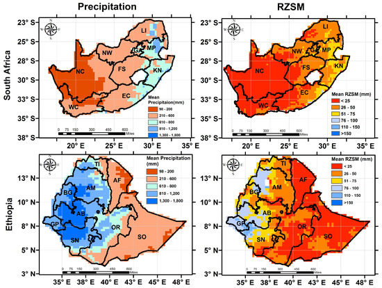 Spatial variability of precipitation (derived from CHIRPS precipitation data) and RZSM (derived from United States Department of Agriculture-Foreign Agricultural Services (USDA-FAS) soil moisture data) over South Africa (top row) and Ethiopia (bottom row) for the period of 2010–2017. The locations of the each province of South Africa (NC: Northern Cape, WC: Western Cape, EC: Eastern Cape, NW: North West, FS: Free State, KN: KwaZulu-Natal, MP: Mpumalanga, GA: Gauteng, and LI: Limpopo) and Ethiopia (SO: Somali, OR: Oromia, SN: Southern Nations, GP: Gambela Peoples, BG: Benshangul-Gumaz, AM: Amhara, TI: Tigray, AF: Afar, and AB: Addis Ababa) are also indicated.