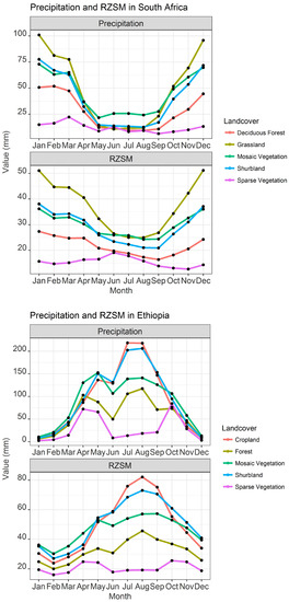 The monthly precipitation over Ethiopia and South Africa is driven mainly by the position of the intertropical convergence zone (ITCZ), which changes over the course of year [52,53]. A majority of the rainfall in Ethiopia falls during the summer seasons when the ITCZ is at its most northern position; however, the amount of rainfall also varies as a function of land cover (Figure 7). For example, forest, cropland, grassland, and shrub land show identical rainfall patterns with one main wet season (June–September) and a secondary wet season (February–May), where the highest rainfall occurs during the month of September (Figure 8). Over sparse vegetation, the major rainfall falls during the summer and winter season, as most of this land cover is located in the southern part of the country, where the rainfall timing is associated with ITCZ, which passes through the southern position of the equator at that time. The monthly RZSM follows the rainfall distribution reaching the wettest soil moisture conditions during the month of September. The position of ITCZ also results in two distinct seasons in South Africa—a wet and dry season roughly from November–April and May–October, respectively. The monthly soil moisture time series captures this seasonality, as seen in Figure 2. The monthly rainfall and soil moisture time series across South Africa vary with land cover, where regions covered by the grassland and sparse vegetation receive the highest and lowest amount of precipitation and soil moisture, respectively (Figure 8).