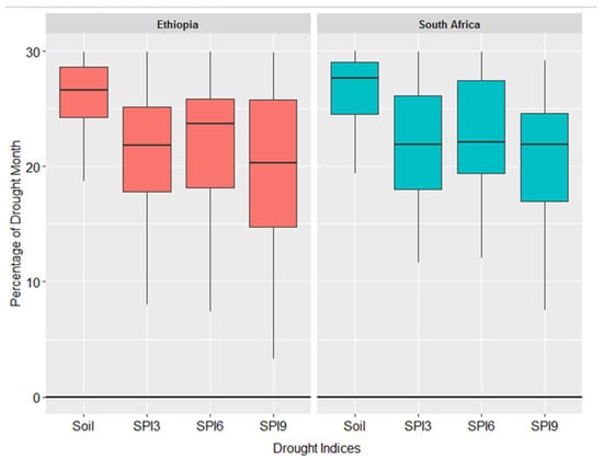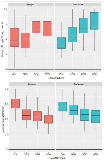 Comparison of percentage of months with drought conditions, maximum drought duration, and drought intensity over Ethiopia and South Africa for multiple drought indices. The center line of each boxplot depicts the median value (50th percentile) and the box encompasses the 25th and 75th percentiles of the sample data. The whiskers extend from q1 − 1.5 × (q3 − q1) to q3 + 1.5 × (q3 − q1), where q1 and q3 are the 25th and 75th percentiles of the sample data, respectively.