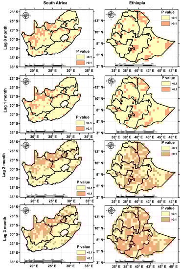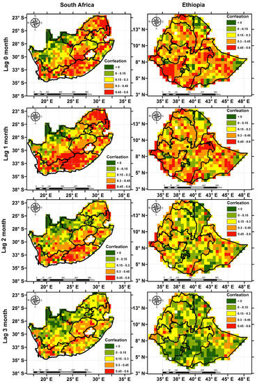 Variations in RZSM substantially influence the vegetation dynamics (i.e., NDVI), which is a widely used vegetation index. Therefore, correlation analysis between RZSM and NDVI anomalies is important to understand the impact of changes in soil moisture on vegetation growth, which can be effectively utilized for early warning of time and areas of increased food insecurity [40,54]. The correlation of the RZSM and NDVI anomalies varied with the geographic location and the degree of lag time. The highest positive correlation coefficients and confidence level (i.e., p-value < 0.1) are observed when soil moisture change is concurrent or precedes the change in NDVI by one month. In most of the locations, NDVI and RZSM anomalies have positive correlations; however, some regions indicate negative correlation at higher lags due to coincidence of negative NDVI anomalies with positive soil moisture anomalies [55]. In South Africa, the semi-arid Western Cape and Eastern Cape show higher coefficients compared with other parts of the country as the vegetation growth in those regions has high reliance on root zone soil moisture [56,57]. No spatial variability in the lag correlation values was observed over Ethiopia (Figure 10). We further investigated the variation of the soil moisture and NDVI relationship as a function of major land cover types. The highest agreement was found over areas covered by grassland for both study areas, while the lowest agreement was achieved over the shrub-covered areas in Ethiopia and South Africa (Table 2). This is partly due to the fact that grassland roots are located on the shallow depths and are more sensitive to changes in soil moisture than deep rooted plants such as shrubs.