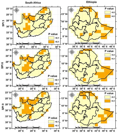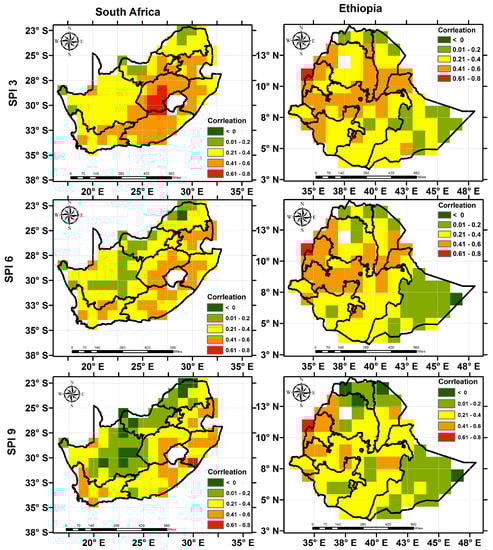 A correlation analysis was carried out between RZSM anomalies and meteorological-based drought indicators to evaluate how well the meteorological-based drought indicators represent agricultural-based drought. Such information could be used to help indicate times and areas that are likely to experience agricultural stress. It is envisaged that such approaches will improve drought monitoring and early warning systems that rely mostly on meteorological indicators [58]. The GEE-based inter-comparative analysis between soil moisture anomalies against SPI showed high agreement and alludes to the value of combining such datasets to compliment a regional drought assessment that incorporates both meteorological and agricultural drought. Over both study regions, SPI3 had higher correlation values compared with SPI6 and SPI9 (Figure 11), which indicates that SPI3 captures more of the agricultural drought. The performance of the meteorological drought indices varied spatially. In the case of South Africa, the correlation values were relatively higher and statistically significant (p-value < 0.1) in the Western Cape and Eastern Cape compared with the Northern Cape of the region. The spatial distribution of the correlation for all meteorological droughts in Ethiopia have similar pattern, where higher and lower correlation values are generally distributed over the northwest and northeast side of the country, respectively. The highest correlation between the soil moisture anomalies and meteorological drought indicators are associated with the cropland (Table 3), which is consistent with [59],who showed that a 3-month SPI has the highest correlation with vegetation growth on croplands of the midlatitude U.S. Great Plains.