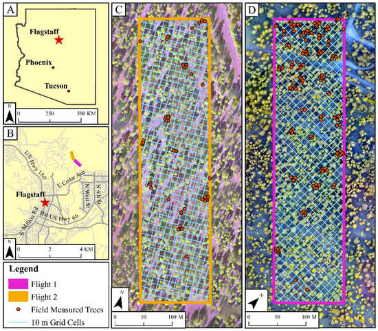 Vicinity map of our study site, UAV flight areas, and field sampling locations: (A) Location of our study area in within the state of Arizona, (B) UAV flight locations and their proximity to Flagstaff, Arizona, USA, and (C, D) Both UAV flight areas overlaid on false color UAV imagery with points representing each field measured tree.