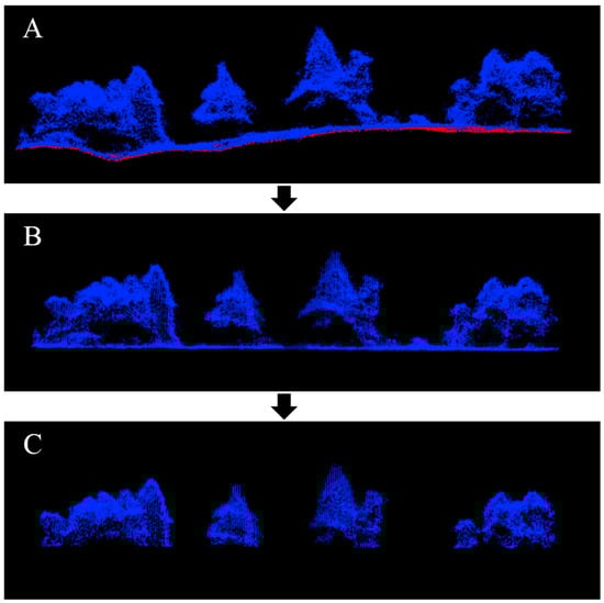 Point cloud pre-processing prior to tree segmentation: (A) Point cloud with initial ground classification are displayed in red, (B) Point cloud that has been normalized and filtered to remove ground points, which still included some non-tree points, and (C) The final point cloud after the second ground filtering and NDVI threshold only included tree points.