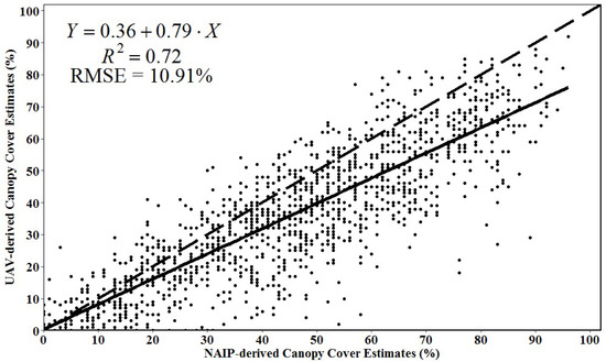 Regression relationship between the UAV- and NAIP-derived canopy cover estimates with 10 m resolution. The dashed line represents the 1:1 line, and the solid line is the fitted linear regression line.