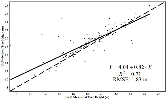 Linear regression model between the UAV image-derived and field-measured individual tree heights. The solid line represents the fitted regression line and the dashed line is a 1:1 line for reference.