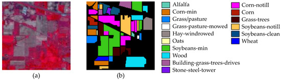 The first dataset is the Indian Pines dataset. This dataset is widely used in hyperspectral classification, and it is captured by the visible/infrared imaging spectrometer (AVIRIS) in Northwestern Indiana. It covers the wavelength ranges from 0.4 to 2.5 μm with 20 m spatial resolution. The size of the dataset is 145 × 145 pixels, and 10,249 pixels are labeled. The labeled pixels are classified into 16 classes. There are 200 bands available after removing the water absorption channels. A false composite image (R-G-B = band 36-17-11) and the corresponding ground truth are shown in Figure 4a,b. The number of training and testing samples is summarized in Table 1.