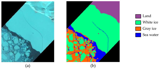 Baffin Bay dataset and corresponding ground truth. (a) False color composite image; (b) The ground truth image with 4 classes.