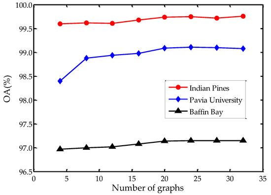 In the proposed SS-RMG, the number of graphs is an important parameter. We present the experiments about the effect of . Figure 7 illustrates the influence of graph numbers on three datasets. We can see that there is an increase when . When is above 20, the OA values on three datasets tend to be stable. Although utilizing more graphs may contribute to a better result, the improvement is slight. Therefore, we may draw the conclusion that is an available setting, since continuously increasing the number of graphs contributes little to the improvement of accuracy.