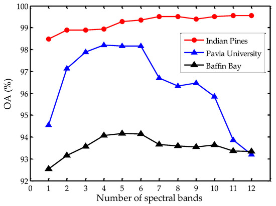 The number of bands used in the proposed SS-RMG also affects the final classification results. Here, we set the number of bands from 1 to 12 to analyze the influence on the three datasets, as illustrated in Figure 8. It can be observed that after an increase from 1 to 7, the value of OA on the Indian Pines dataset presents a steady tendency. However, on the Pavia University dataset, there is a sharp decline when the number of bands is above 5. Similarly, on the Baffin Bay dataset, there is a slow decline when the number of bands is above 6. In our implementations, we set the number of bands as 5. Using 5 spectral bands in the proposed SS-RMG may not be the best choice for all the experimental datasets. Here, we choose a relatively small number, within allowable hardware resources, for better analysis. On the Indian Pines dataset, the spatial and spectral feature vector dimension is 495. 295 elements correspond to spatial features and 200 elements correspond to spectral features. On the Pavia University dataset, the spatial and spectral feature vector dimension is 398. 295 elements correspond to spatial features and 103 elements correspond to spectral features. On the Baffin Bay dataset, the spatial and spectral feature vector dimension is 515. 295 elements correspond to spatial features and 220 elements correspond to spectral features.