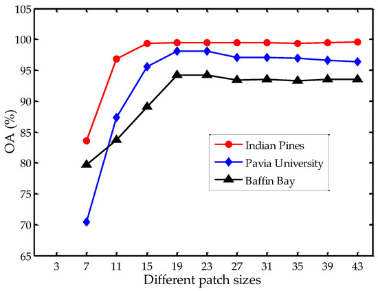 Besides the number of graphs and the number of spectral bands, the patch size w in LBP feature extraction is also an important parameter. We set w to 7, 11, 15, 19, 23, 27, 31, 35, 39 and 43 to analyze the influence on the three datasets, as illustrated in Figure 9. We notice that there is a sharp increase in classification accuracy when w ranges from 7 to 19. The accuracy tends to be stable when w is 19 or larger on the Indian Pines dataset. On the Pavia University and Baffin Bay datasets, the classification accuracies decline slightly when w ranges from 19 to 43. A larger patch size would take pixels of different classes into account, and therefore have negative effects in classification accuracy. If the patch size is too small, the extracted features may not be representative for the center pixel’s spatial characteristics. Hence, in our experiments, we set the patch size in LBP feature extraction to 19 × 19 pixels.