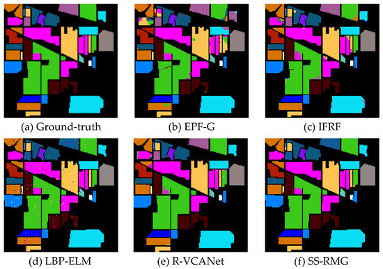 Classification results by different methods on the Indian Pines dataset. (a) Ground-truth map; (b) EPF-G; (c) IFRF; (d) LBP-ELM; (e) R-VCANet; (f) Proposed SS-RMG.