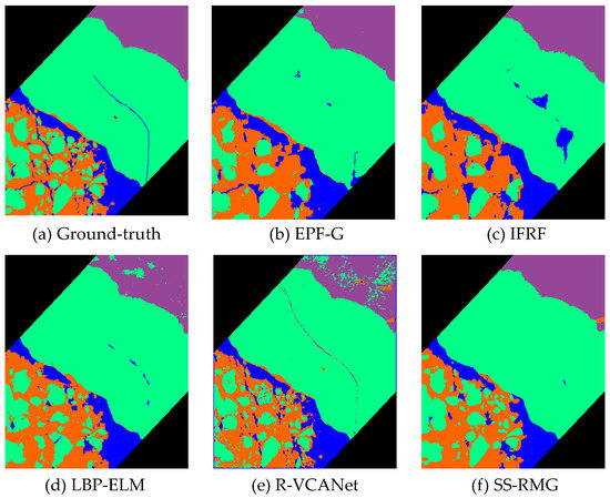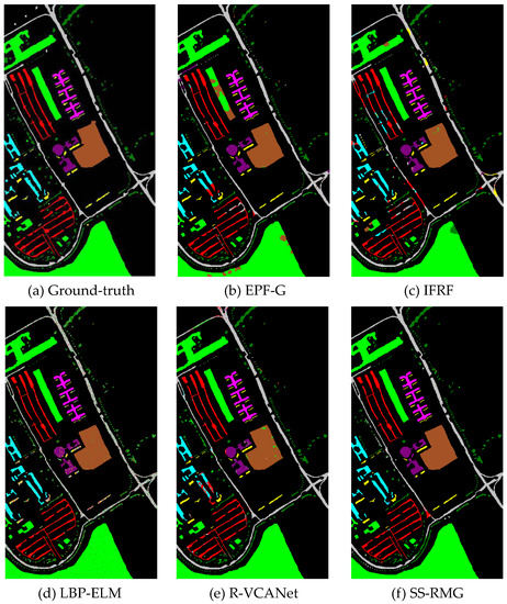 Classification results of different methods on the Pavia University dataset. (a) Ground-truth map; (b) EPF-G; (c) IFRF; (d) LBP-ELM; (e) R-VCANet; (f) Proposed SS-RMG.