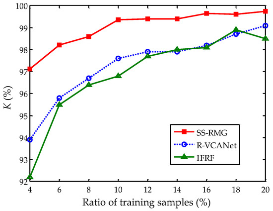 The number of training samples is an important concern in hyperspectral image classification, since the number of training samples is often limited. In some studies, 50% of all the labeled pixels are selected as training samples [18,27]. Figure 13 shows the influences of training samples on the Indian Pines dataset. The number of training samples is large enough to depict the tendency. SS-RMG, R-VCANet, and IFRF present the best classification results among all the methods, therefore they are displayed in Figure 13. These results are obtained by averaging the accuracy results of 30 runs. When the ratio of training samples is above 10%, the classification accuracies of SS-RMG tend to be stable. Therefore, we draw the conclusion that 10% is enough to learn a representative model for this dataset. Moreover, it can be observed from Figure 13 that, compared with R-VCANet and IFRF, the proposed SS-RMG can achieve good classification results with less training samples.