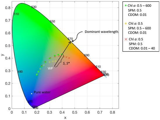 Chromaticity diagram showing the location of the white point (WP) and the x, chromaticity coordinates of a range of water types modelled by adding optically active substances to pure water according to a bio-optical model [13]. Dominant wavelength and distance to the white point (S) are illustrated using the rightmost round data point. Purity (S*) is the distance S relative to the distance of the white point to the horseshoe-shaped envelope. The units for the optically active substances are: chl a (mg m−3), suspended particulate matter (SPM) (mg L−1), and coloured dissolved organic matter (CDOM) (absorption at 440 nm m−1).