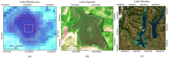 Landsat 8 Operational Land Imager (OLI) images of three example lakes showing the 3-by-3 pixel area for which data was extracted. The outlines shown were taken from the FENZ geodatabase. North is up in all images. (a) Lake Rotokawau (volcanic lake) on 3 March 2017; (b) Lake Ngaroto (peat lake) on 2 March 2016; and, (c) Lake Wanaka (glacial lake) on 3 March 2017.