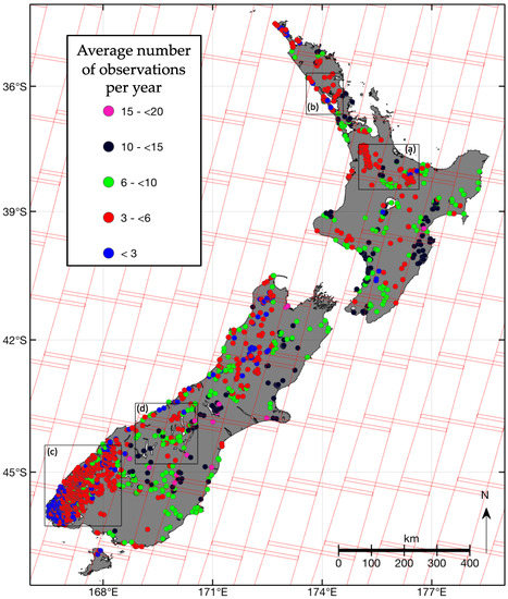 The average annual number of images for each lake in the data set is shown on the map in Figure 5 (also available at lakes.takiwagis.co) along with the locations of the OLI ground paths. Lakes in areas of overlapping paths systematically show higher frequency of observations relative to lakes in non-overlapping areas, and variability in observation frequency within overlapping or non-overlapping ground path areas is consistent with statistics of sunshine hours [50]. For example, a small lake (lake ID 25550 in the FENZ geodatabase) near Nelson (41.27°S, 173.28°E), one of the sunniest cities in New Zealand, was observed successfully 20 times per year. Lakes in Hawkes Bay (39.49°S, 176.91°E) have high observation frequencies, as do lakes near Lake Tekapo (43.90°S, 170.53°E) in the central high country of the Canterbury region. Cloudiness is highest along the west coast of New Zealand, especially in Fjordland at the south-westernmost end of the South Island, which is being reflected by annual images fewer than four.