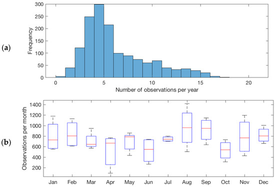 (a) Frequency distribution of average number of observations per year for New Zealand lakes. (b) Box plot of the average number of observations of New Zealand lakes by month. On each box, the central mark indicates the median, and the bottom and top edges of the box indicate the 25th and 75th percentiles, respectively. The whiskers extend to the most extreme data points.