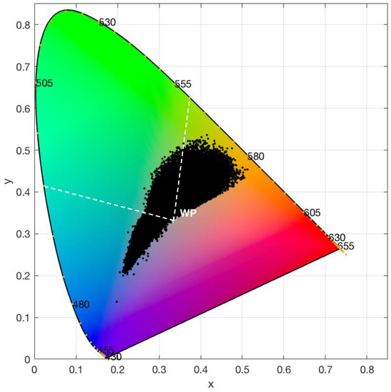 Chromaticity coordinates are then calculated from the X, Y, and Z using Equations (4)–(6); the perceived colour of a given reflectance spectrum is defined by any pair of chromaticity coordinates and can be plotted in a chromaticity diagram, e.g., x and y, as shown in Figure 1. The horseshoe-shaped envelope (locus) is constructed from the x and y values calculated from monochromatic light at each wavelength and therefore the space enclosed in it encompass all possible chromaticity values. The centre of the chromaticity diagram is the “white point” at which x = y = z = ⅓. Any pair of x, y coordinates of an upwelling radiance spectrum can be identified by the hue angle (α), which is the angle of the line drawn from the white point to the x, y coordinate and the x-axis of the plot in anticlockwise direction. We calculate α using the four quadrant arctangent function atan2 in Matlab (Equation (7) in [22]):
