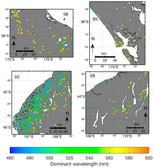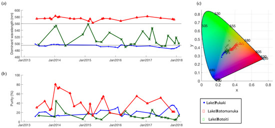 Inspection of the distribution of dominant wavelength observations within lakes revealed that a large number of lakes are predominantly blue or predominantly yellow-orange, but there are no lakes that are only green (Figure 10). Lakes that are green on average typically show observations across the entire spectrum. For example, Lake Rotomanuka, a eutrophic peat lake of 8 m maximum depth in an agricultural catchment [52], is persistently orange with a mean dominant wavelength of 575 nm and purity from 13 to 80% (Figure 11). Lake Pukaki is a glacial lake fed by cold, short-transit-time rivers with little interaction with vegetated terrain [26]. It is ultra-oligotrophic and famous for its turquoise-blue water that is due to inputs of fine, highly scattering, and weakly absorbing glacial ‘flour’ [1]. The dominant wavelength of Lake Pukaki varies little (485–513 nm with a mean 494 nm) and its purity ranges from 3 to 36% (mean 19%) (Figure 11). A lake with markedly variable colour is Lake Rotoiti. This monomictic, eutrophic volcanic lake has a maximum depth of 124 m [53] and it shows seasonal variability in the time series of dominant wavelength ranging from 490 to 571 nm (mean of 521 nm). Colour purity ranges from 5 to 46% with high values coinciding with maxima in dominant wavelength (Figure 11). This pattern is likely caused by seasonal blooms of picocyanobacteria [54], during which chl a concentrations typically reach 10 mg m−3.