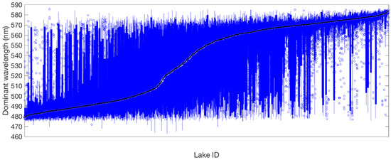 Box plot of the distribution of dominant wavelength in 1486 lakes ordered by median dominant wavelength (black line). The bottom and top edges of each box indicate the 25th and 75th percentiles, respectively; blue lines extend to the most extreme data points not considered outliers, and outliers are shown as circles.