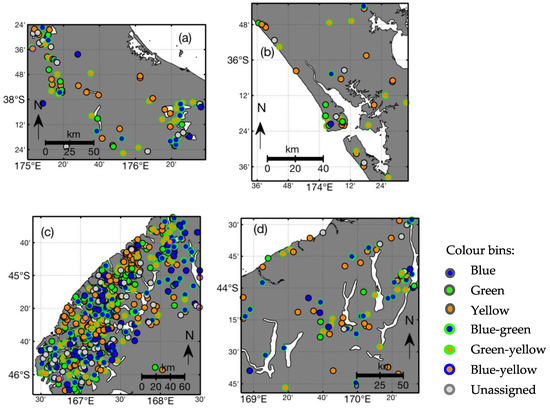 As we expected from our knowledge of New Zealand lakes, our dataset covers a large range of natural water colours and we look forward to comparable large-scale studies to fully define the global boundaries of the point cloud in the chromaticity diagram (Figure 7). As an initial attempt to handle the diversity of lake colour, we defined a simple heuristic classification of lakes into colour bins (Table 1), which aimed to capture the mean properties and identify cases where mean properties poorly represent lake state. With this approach we characterised both water type (colour of individual observations) and lake type (i.e., colour bin membership). The colour of individual observations may be useful for algorithm selection in multi-algorithm approaches to inland water applications [58] and the colour-bin classification relates a lake to its environment, facilitating further ecological studies of the drivers of lake water quality at a range of spatial scales. Other classifications of optical water types were typically designed using in-situ hyperspectral data and in-situ optically active constituents e.g., [59,60]. When applying these classifications to satellite data, misclassifications may occur due to the reduced information content of multispectral data relative to the hyperspectral in-situ reflectances. Our approach is solely based on multispectral satellite data and quantifying the limitations that this imposes on algorithm selection and water quality monitoring is the goal of ongoing validation of remotely sensed water colour with in-situ hyperspectral and water quality data.