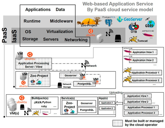 All middleware software or components, such as GeoServer, Zoo-Project, and the database management system, should be used, as instances, directly on the IaaS service. PostgreSQL [26], the open source database management software, serves the client by retrieving the processing status. The image database was not built in this study. Actual image processing was conducted by image files, and metadata of the image data, used in the experiment and information of the processing status, was stored to communicate with OGC WPS interfaces in this database management system. GDAL [27] is an open source software that helps to clip the processing zones and convert to an image on the Web after it has been processed using remote sensing algorithms in the Orfeo Toolbox [28]. Clipping is a function for extracting only those images that fall within a certain range from rectangular image data. GeoServer [29] was employed to manipulate the satellite image dataset and visualize the processing results. There are a number of things to consider, when applying PaaS, in order to make the actual on-demand approach. An app, which is a small application, developed by installing the web server and runtime environment, could be distributed using IaaS, PaaS or both types of services with IaaS. Since PaaS offers a web server and runtime environment, developers use the PaaS to build the right runtime environment and deploy the application in that environment and from the Web. The way to use virtual machines as hypervisors is to emulate hardware on top of the hypervisor, logically creating separate systems. On the other hand, the container arrangement provides an independent application performance environment by loading the required kernels and libraries. The container approach has advantages in terms of resource efficiency, although it is not independent of resource use, making it difficult to measure the amount of infrastructure resources. Application services of IaaS are deployed on a per-instance basis, whereas those of PaaS are deployed on a container-wide basis.
