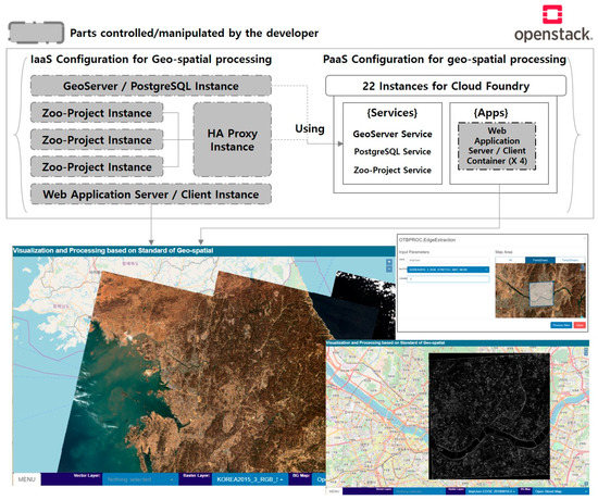 The methods for configuring cloud computing services for PaaS can vary depending on the hardware conditions of service management and operation. In particular, PaaS is not only immediately applicable to general hardware, but it can also be configured above IaaS. PaaS actually works on top of hardware or virtualized resources in the following cases: PaaS could be offered on top of existing IaaS, which is not offered by the same provider; it could be offered by the same provider; and it could be built on top of a certain infrastructure, on top of which no IaaS services are offered. Thus, the strategies for PaaS application implementation are also diverse. The trial system with the geo-spatial data processing function was built on the PaaS cloud environment for testing in order to perform performance evaluations. To deploy PaaS, the open source scheme was employed in order to configure PaaS over IaaS, such that the IaaS-based cloud service was leveraged to compare the performance of the PaaS-based one. To deploy PaaS running on IaaS, all the services needed to support the geospatial application or service were manually deployed using virtual hardware in order to compare the processing performance. Both solutions for deploying IaaS and PaaS in this trial system are open-source; IaaS was realized via OpenStack [30], while PaaS, via Cloud Foundry [31] over the implemented IaaS cloud. Both are widely used as open-source projects for the development of cloud computing technology and services. The PaaS is a cloud computing environment, linked to the e-government framework, which is based on open source for the construction of public purpose Web services in Korea [32]. Cloud Foundry was adopted, along with many other open source PaaS products or solutions [33]. That is the main reason why Cloud Foundry was applied in this study. On the other hand, PaaS can be deployed in many IaaS environments, but OpenStack was applied because it is the most commonly used cloud computing environment. OpenStack is a collection of services, such as orchestration, block storage, networking, computing, measurement, authentication, and dashboard. The primary node configuration, which is deployed using OpenStack, consists of a controller and a computer. The controller provides a function for controlling clients that call each hypervisor an API. In a hypervisor, one of the server virtualization types, virtual servers are separate because the OS and applications are virtualized on a unified basis. A product, named Nova, for the controller and computer functions in OpenStack is designed for horizontal expansion, regardless of whether a hypervisor is used, and provides the ability to interlink with legacy systems or third-party products. If necessary, the IaaS environment is configured to use block storage and object storage with additional storage nodes. A controller, a computer, and block storage are required to build the PaaS-based service for experimentation.