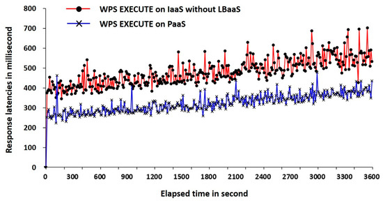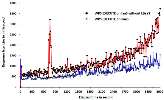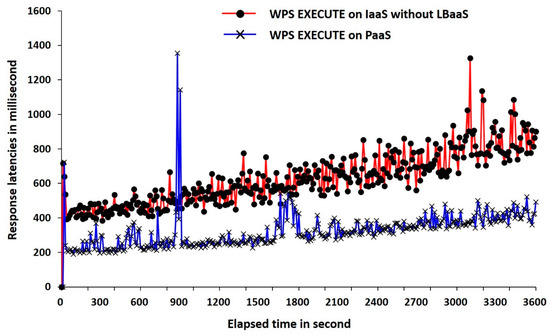 Performance evaluations of the ‘DescribeProcess’ and ‘Execute’ requests, among five OGC WPS 2.0 requests, such as GetCapabilities, DescribeProcess, Execute, GetStatus, and GetResult, were carried out. The results of performance testing for WPS, executing the operation in an IaaS environment without LBaaS and a PaaS environment by varying the number of threads, are shown in Figure 4, Figure 5 and Figure 6. The mean values of the results of the three experiments for the ‘DescribeProcess’ request are presented in Figure 7. In Figure 4, Figure 5 and Figure 6, the horizontal axis, representing the ramp-up period, shows the elapsed time in seconds. An experiment was performed, varying the ramp-up period by one hour. Since multiple experiments with different threads and variables could change the networking status and hardware conditions, instances on IaaS and apps on PaaS were adjusted to their initial state whenever each experiment was carried out in order to perform the experiment under the most similar environments possible. The vertical axis shows the response latencies, indicating the response time of each thread request in milliseconds. Parallel processing through HAProxy for adequately distributing the processing resources to the instances and log recording in the Zoo-Project confirmed that all three instances were being used for processing. Both IaaS and PaaS services represent that the response time increased over time, owing to a gradual increase in the load on the WPS servers, and PaaS services are more responsive than those running on IaaS.