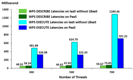 The error rate results, which were obtained through the table of the summary report of the JMeter tool, are shown in Table 4. Error rates which represent failure rates are expressed as a percentage regarding the result of incomplete or unclear responses to requests. Due to the asynchronous processing functionality of WPS 2.0, the response to the request is successful, but not necessarily the completion of the process. When there is too much concurrent processing or application overloading, the execute response value may fail. In error rates for the PaaS service, both the describe and execute operations are found to be less than 0.4% of any threads. This means that 28 requests of 70,000 requests by 700 threads have failed. Error rates of IaaS without LBaaS are higher than those of PaaS and are highly proportional to the number of threads. One of the reasons is that the response time is greater and, thus, the load becomes greater over time. This shows that as the load gets higher, when the number of threads is increased, the error rate also gets higher, except in one case of a PaaS execute with 500 threads. The maximum error rate rises to about 1.8% with 700 threads, which is a failure of 126 times. In comparison, the error rates for IaaS are 4.7 times higher than those for PaaS.