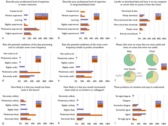 The participants’ responses from the qualitative survey provided an overall positive assessment of the SnowCloud framework (SnowCloudMetrics and SnowCloudHydro) (Figure 4a–j). The professional background of the users was comprised of more experienced water resource professionals (Figure 4a; 9.5 years for English speakers, and 12.6 years for Spanish speakers). The participants’ background in cloud computing was varied, ranging from beginners to experienced users (Figure 4b). Following this same trend, the participants used both downloaded and cloud-based data (Figure 4c).