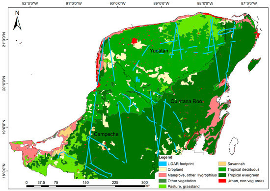 Study area. Land use and vegetation map of Mexico from the Mexican National Institute for Statistics and Geography (INEGI) Series IV [43] with the available airborne LiDAR strips.
